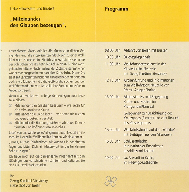 W ko¶ciele St. Marien podczas Mszy ¶w. o godz. 12-tej wspólnota ze Spandau po¿egna³a ks. prob. Tadeusza Niewêg³owskiego, który po piêciu latach pos³ugi kap³añskiej wraca do Polski. Po¿egnanie mia³o uroczysty charakter, by³y przemówienia, kwiaty, podziêkowania i gor±ce oklaski wiernych. Podnios³o¶æ Eucharystii podkre¶la³ Chór Auxilium pod dyrekcj± Agnieszki Wi¶niowskiej-Kirch. Wyst±pili równie¿ Agnieszka Siewiec-sopran, Tomasz Rakocz–bas i Jakub Sawicki–organy. Oprawê muzyczn± cechowa³ niezwykle wysoki poziom artystyczny wykonywanych utworów. Ksi±dz Proboszcz zawsze wysoko ocenia³ Chór Auxilium, nazywaj±c go „ambasadorem Polskiej Misji Katolickiej w Berlinie”.