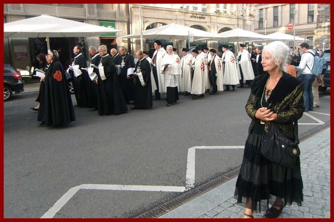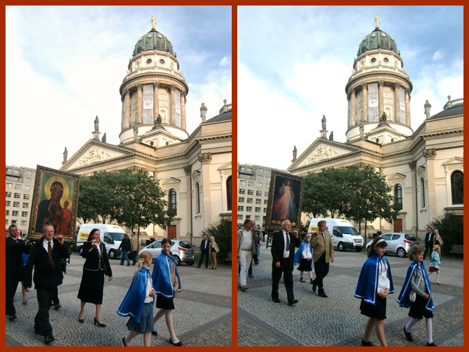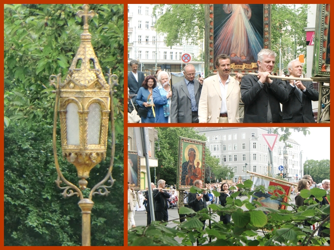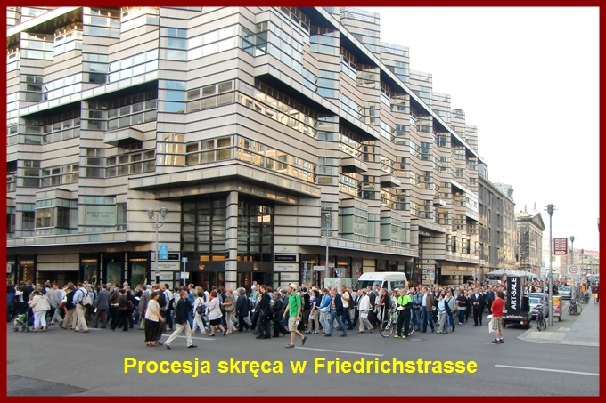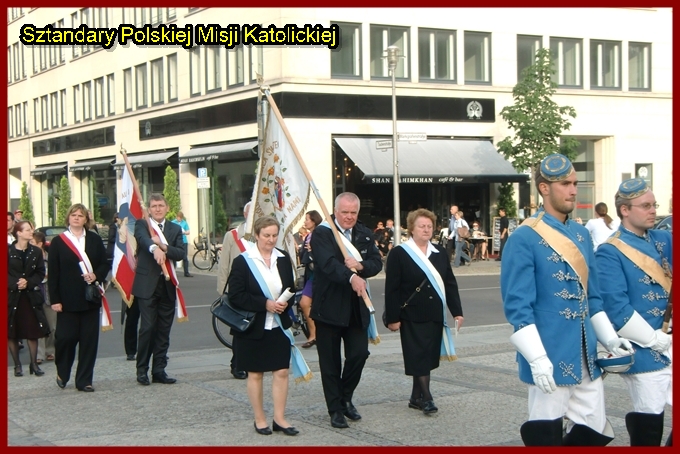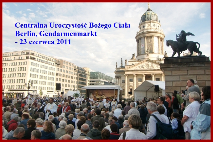 Centralna uroczysto¶æ Bo¿ego Cia³a odbywa³a siê zgodnie z tradycj± na jednym z najpiêkniejszych miejsc Berlina i Europy, gdzie wznosz± siê trzy monumentalne budowle: Niemiecka Katedra, Francuska Katedra i Dom Koncertów. Najpierw odby³a siê Msza ¶w. pontyfikalna, a nastêpnie procesja z Naj¶wiêtszym Sakramentem przesz³a po nobliwych ulicach Berlina, w tym poprzez Friedrichstrasse. Komu zale¿a³o na publicznym wykazaniu mi³o¶ci do Chrystusa, na przyznaniu siê do wiary, ten stawi³ siê w ten pogodny czwartek, aby razem z innymi rado¶nie prze¿ywaæ to jednorazowe wydarzenie. Polska Misja Katolicka odznacza³a siê kolorowo ubranymi dzieæmi, sztandarami i obrazami. Chórzy¶ci brali tak¿e udzia³ w uroczysto¶ci.