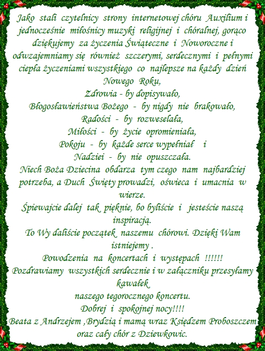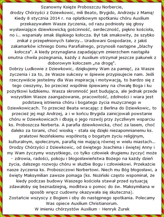 Na koniec moc podziêkowañ ¶lemy do Dziewkowic. Drogi Ksiê¿e Proboszczu dr Norbercie Wons, drodzy Parafianie i Chórzy¶ci z prezesow± chóru Beat± i dyrygentem Andrzejem Filuszem – nasz pobyt u Was przeszed³ naj¶mielsze oczekiwania. Wasza serdeczno¶æ, Wasza go¶cinno¶æ jest nie do opisania. Do dzisiaj wspominamy nieszporowe ¶piewanie, które by³y jednym wielkim chwaleniem Bo¿ej Wszechmocy. Chóralny, wspólnie wykonywany ¶piew, równie¿ z parafianami, by³ poprzez swoj± potêgê niezapomnianym prze¿yciem. Moja ¯ona Krystyna twierdzi, ¿e to ks. pra³at Noziñski z nieba przyczyni³ sie te¿ do tego, aby chór Auxilium znalaz³ siê w „jego” ko¶ciele i tam, przed wystawionym Naj¶wiêtszym Sakramentem razem z Wami móg³ ¶piewaæ psalmy, którymi kiedy¶ modli³ siê sam Zbawiciel.
