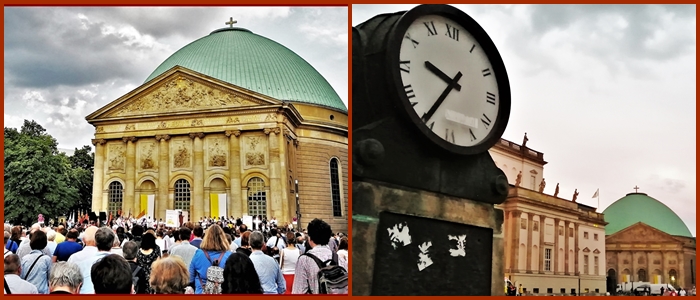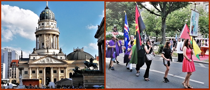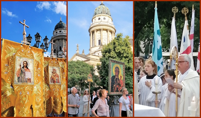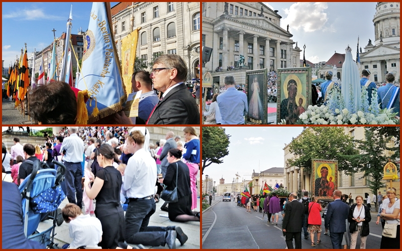 Jak co roku uroczysto¶æ Naj¶wiêtszego Cia³a i Krwi Chrystusa rozpoczê³a siê msz± ¶w. na Gendarmenmarkt w Berlinie. Nastêpnie wyruszy³a procesja z Naj¶wiêtszym Sakramentem najpierw przez Taubenstraße, potem wzd³u¿ Friedrichstraße. Niespodziewanie dla wszystkich po raz pierwszy w dziejach powojennego Berlina wielotysiêczna rzesza wiernych skierowa³a siê na g³ówn± ulicê stolicy Niemiec, na Unter den Linden. Procesjê prowadzi³ arcybiskup Berlina dr Heiner Koch w asy¶cie biskupów, kap³anów, sióstr zakonnych i ogromnej rzeszy wiernych, w tym katolików z ponad stu narodowo¶ci. Barwnie i licznie prezentowa³a siê Polska Misja Katolicka, któr± reprezentowali równie¿ chórzy¶ci z Auxilium.