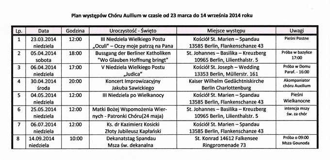 Pomimo rozpoczêcia wakacji chórzy¶ci zebrali siê dodatkowo na próbie w dniu 20 czerwca, aby przygotowaæ siê do wystêpu w czasie pielgrzymki do miejsca urodzenia siê ¶w. Jacka. W dniu 2 wrze¶nia b.r. chór Auxilium Polskiej Misji Katolickiej z Berlina bêdzie ¶piewa³ w Kamieniu ¦l±skim podczas Mszy ¶w. w transmitowanej przez Polskie Radio. Przypomina siê chórzystom, ¿e pierwsza, powakacyjna próba odbêdzie siê 8 sierpnia.