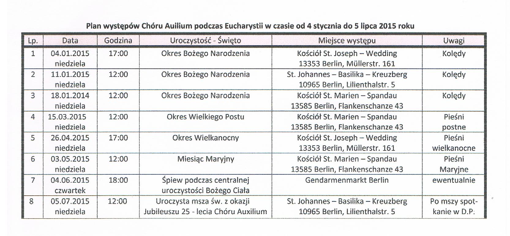 ¦wiêto to w szczególny sposób uczcili ¶piewacy Chóru Auxilium wraz z solistami Johannesem Kirch i Tomaszem Rakocz z Deutsche Oper Berlin oraz Jakubem Sawickim na organach podczas Mszy ¶w. w ko¶ciele St. Marien w Spandau w niedzielê 8 stycznia 2012 roku. Pod muzycznym kierunkiem Agnieszki Wi¶niowskiej – Kirch wykonano szereg polskich kolêd. Mszê ¶w. odprawi³ i kazanie wyg³osi³ ks. Jerzy Barganowski SDB. Po Mszy ¶w. chór wykona³ jeszcze kolêdê „Przybie¿eli do Betlejem”. Wykonawcy zostali nagrodzeni gromkimi brawami i ciep³ym s³owem Ksiêdza Jerzego, który wysoko oceni³ poziom wykonanych utworów i piêkno muzycznej oprawy uroczystej Eucharystii.